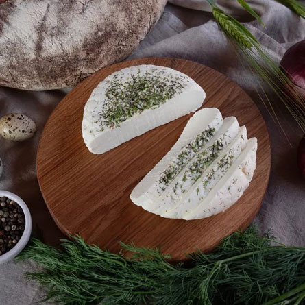 Малосоленый диетический сыр с нежной творожистой консистенцией, укроп добавляет ему особый аромат.